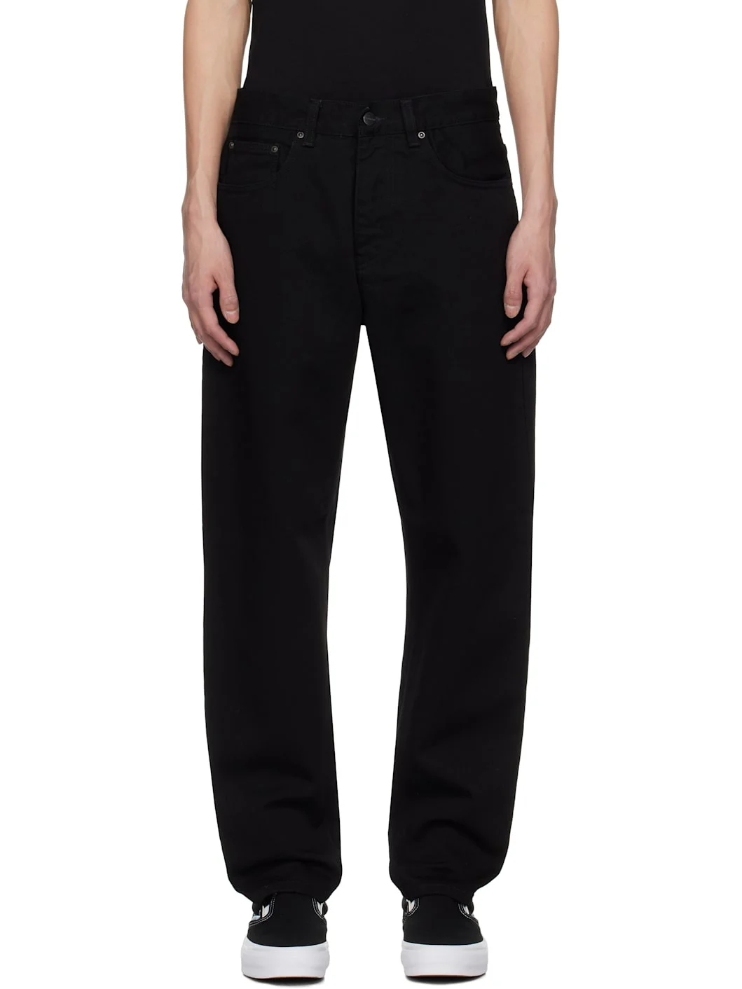 Washed non-stretch 13.5 oz organic cotton denim jeans. · Loose-fit and tapered · Mid-rise · Belt loops · Five-pocket styling · Zip fly · Logo patch at back pocket · Logo-engraved gunmetal-tone hardware Supplier color: Black (one wash) Body: 100% organic cotton. Lining: 65% polyester, 35% cotton. Made in Tunisia 251111M186000