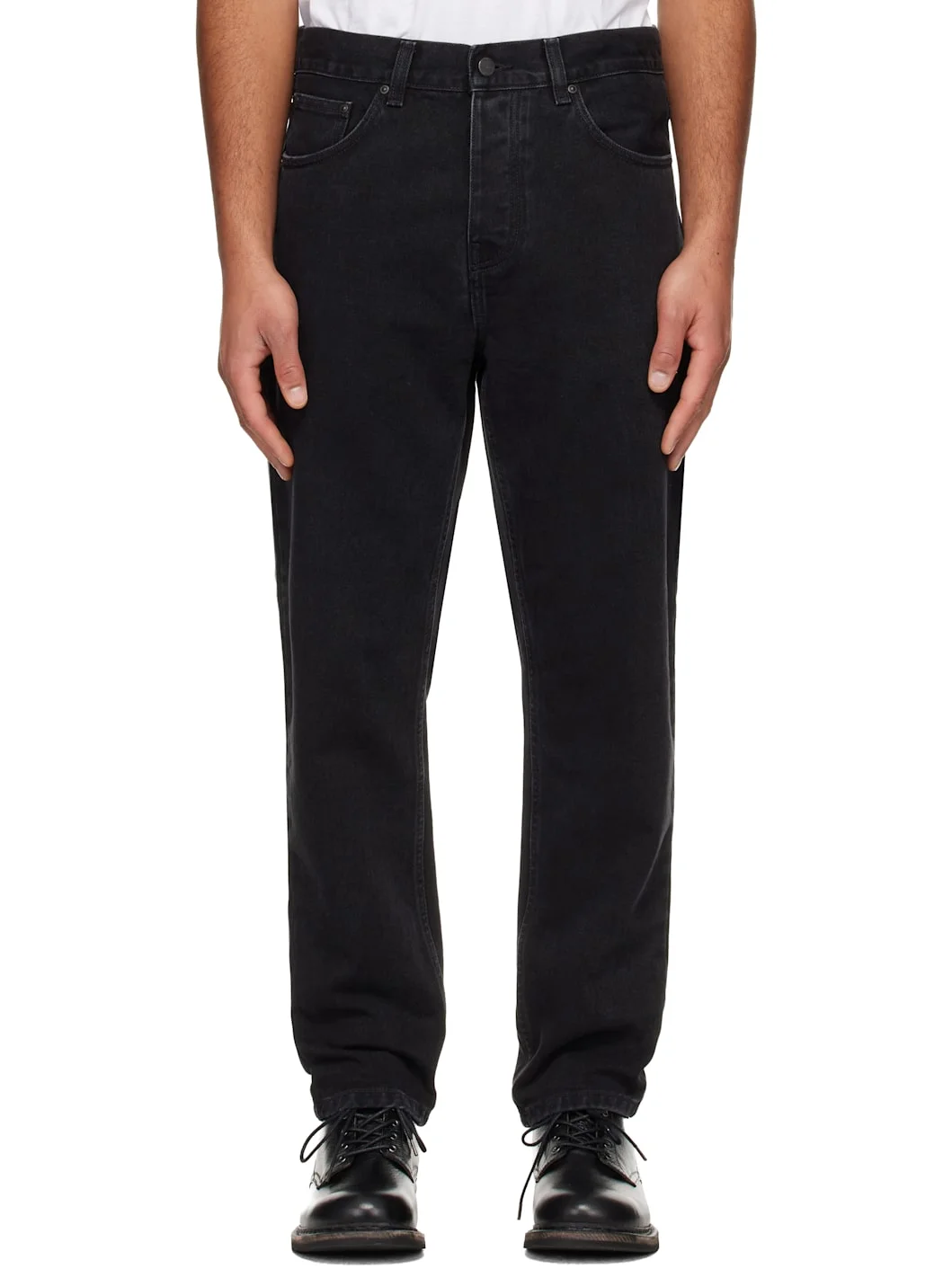 Stonewashed 13.5 oz non-stretch organic cotton denim jeans. · Fading throughout · Loose-fit, tapered · Belt loops · Five-pocket styling · Button fly · Logo patch at back pocket · Logo-engraved gunmetal-tone hardware Supplier color: Black (stone washed) Body: 100% cotton. Pocket lining: 65% polyester, 35% cotton. Made in Tunisia 261111M186004