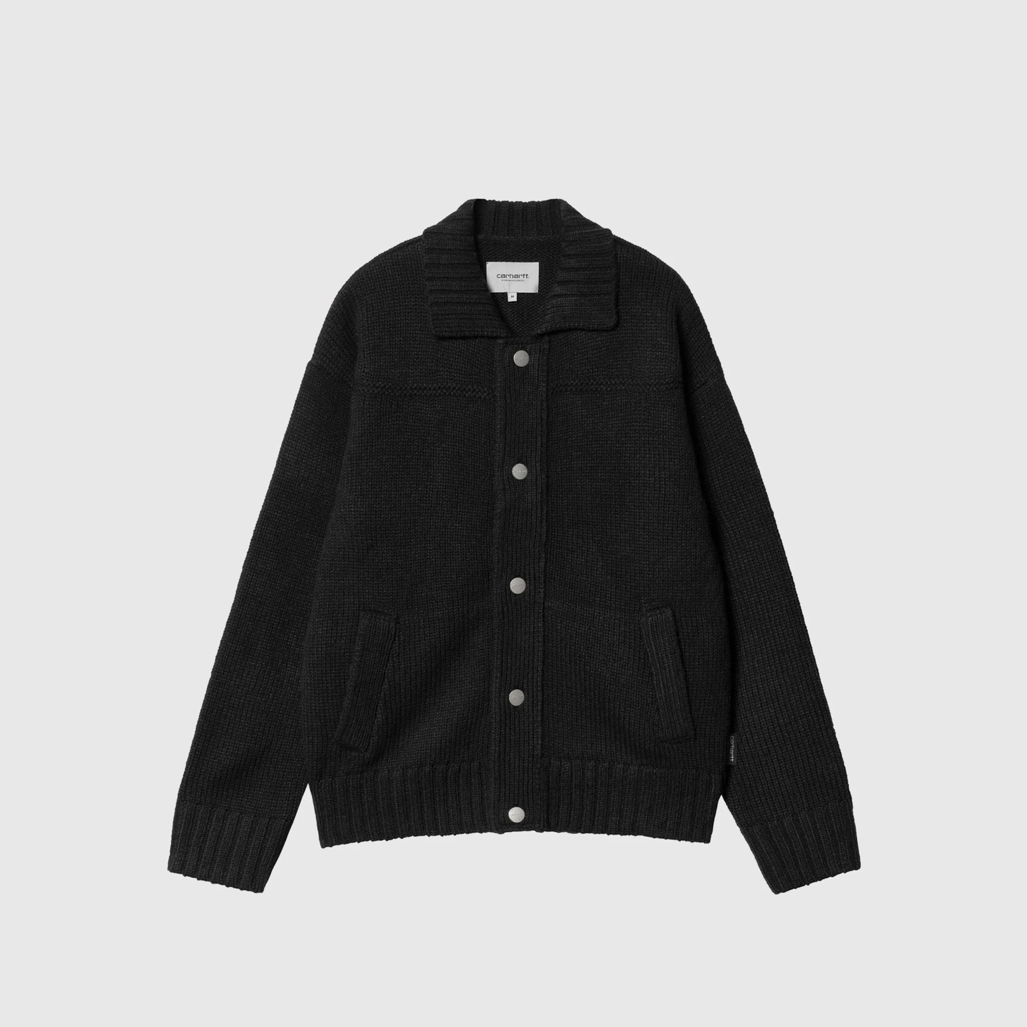 - I034495 89XX - Black - 75% Acrylic, 15% Wool, 10% Nylon - Heavyweight knit - Front metal button closure - Two front welted pockets - Ribbed collar, cuffs, and hem - Woven label at the side seam - Dropped shoulder