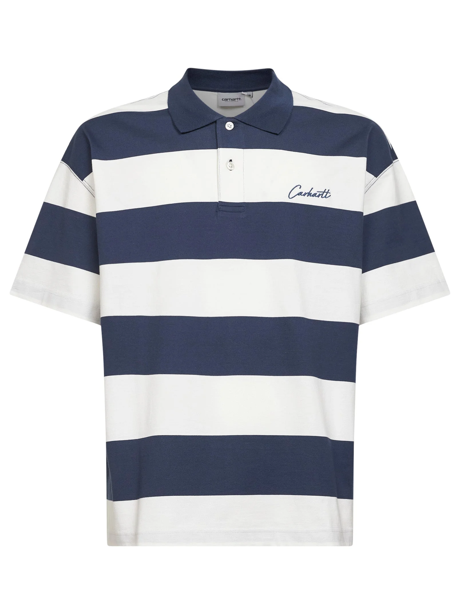 - Front two-button placket - Ribbed polo collar - Short sleeves, dropped shoulders - Contrasting logo lettering embroidered at chest - Straight hem - Midweight organic cotton jersey design with horizontal striped pattern - Loose and boxy fit - Color: blue/white - 100% cotton - Made in extra eu Natural (Veg): Cotton100 % Made in: Season: P26 I036187-3LEXX