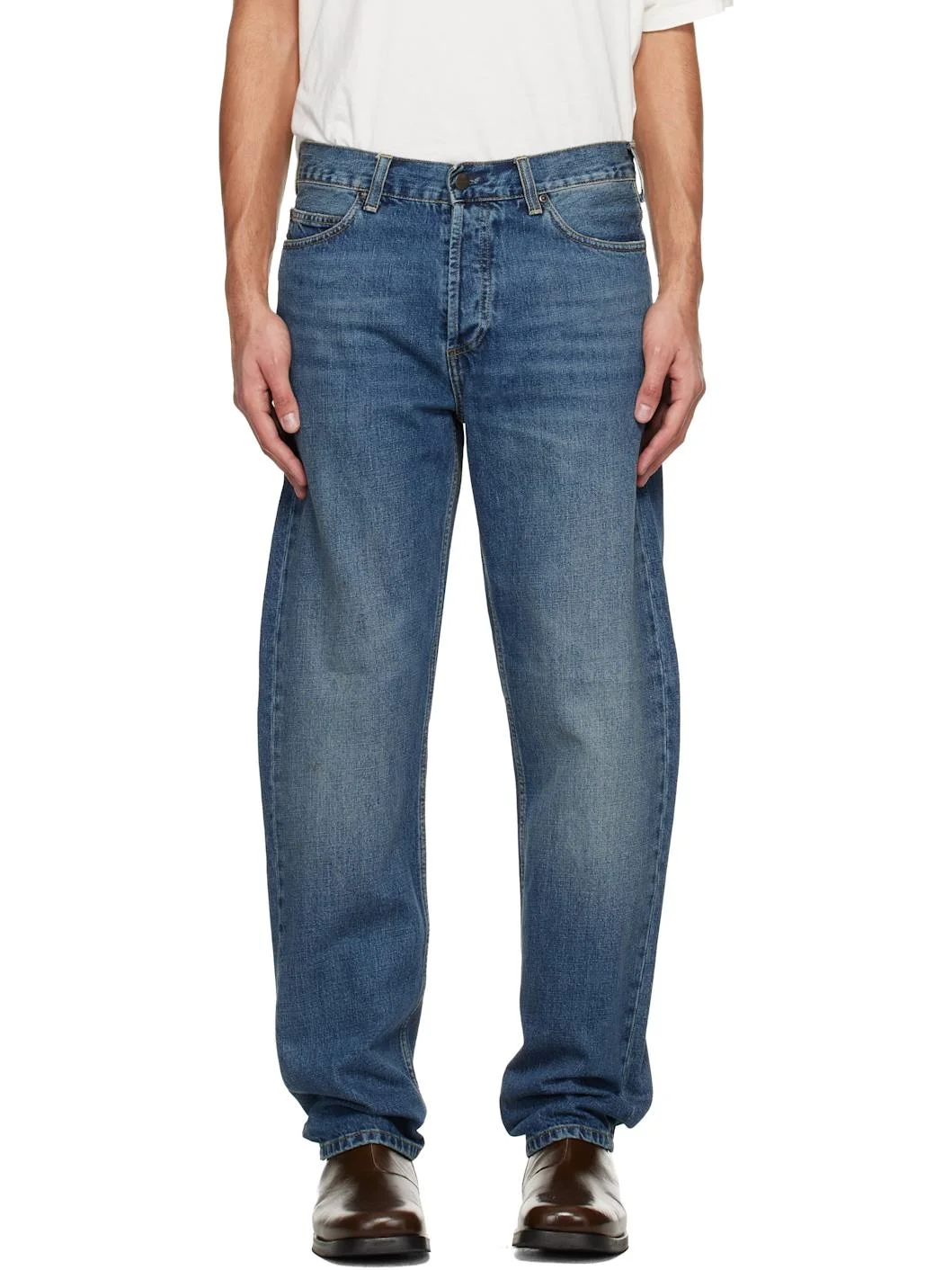 Heavyweight 12 oz non-stretch denim jeans. · Fading and whiskering throughout · Straight-leg · Mid-rise · Belt loops · Five-pocket styling · Button fly · Logo patch at back pocket · Logo-engraved gunmetal-tone hardware · Contrast stitching in tan Supplier color: Blue Dark Used Body: 100% cotton. Pocket lining: 65% polyester, 35% cotton. Made in Tunisia 261111M186025