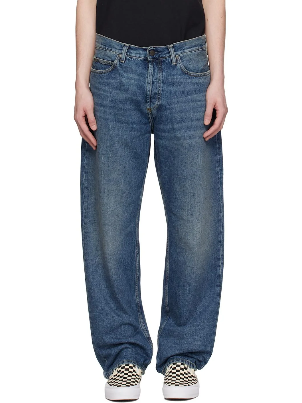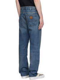 Straight-leg 12 oz non-stretch denim jeans. Fading and whiskering throughout. · Belt loops · Five-pocket styling · Button-fly · Topstitching at back pockets · Leather logo patch at back pocket · Logo-engraved antiqued bronze-tone hardware · Contrast stitching in tan Supplier color: Blue Body: 100% cotton. Lining: 65% polyester, 35% cotton. Made in Tunisia 251111M186032