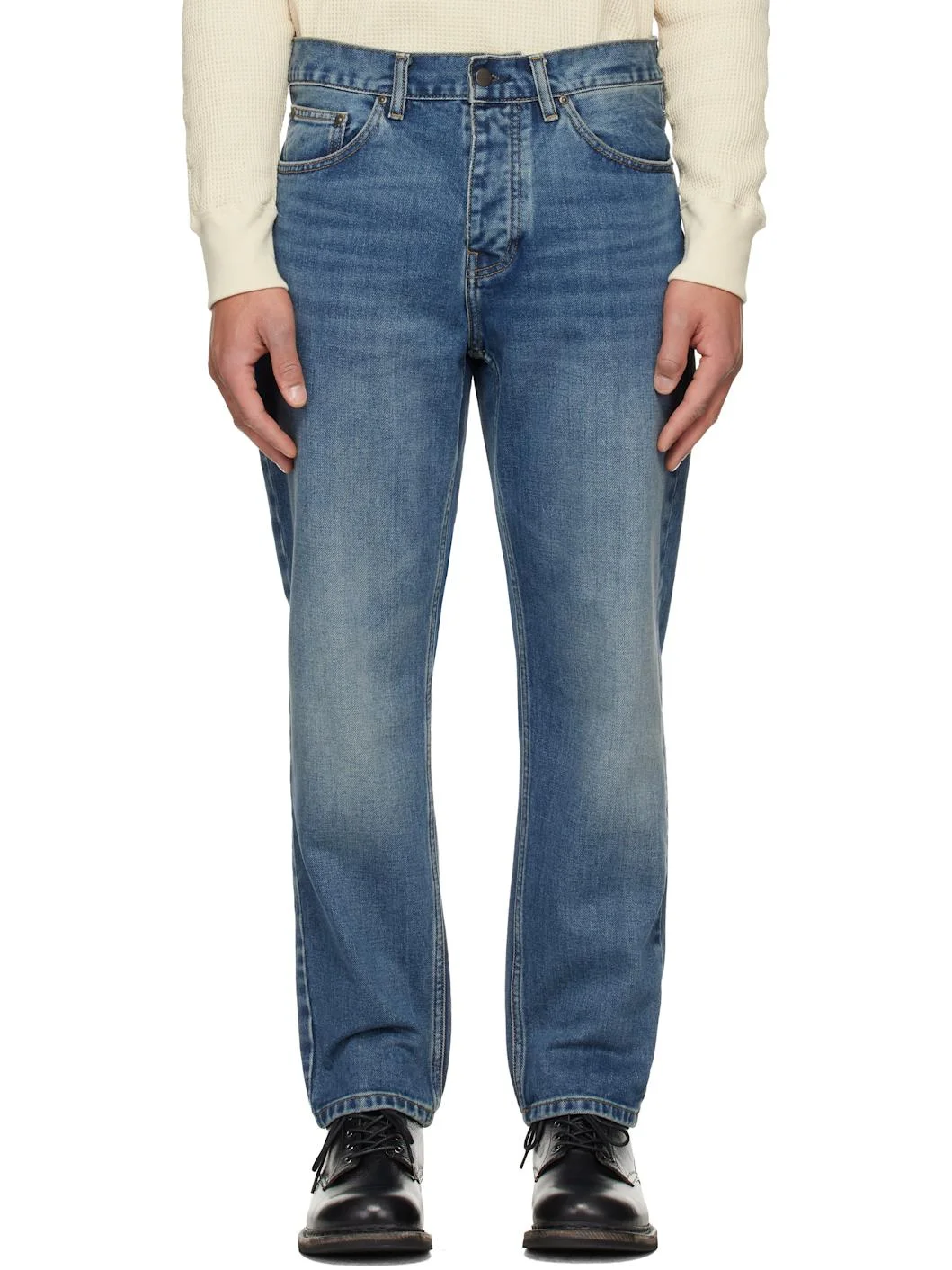13.5 oz non-stretch denim jeans. · Fading and whiskering throughout · Loose-fit, tapered · Belt loops · Five-pocket styling · Button fly · Logo patch at back pocket · Contrast stitching in tan Supplier color: Blue (dark used) Body: 100% cotton. Pocket lining: 65% polyester, 35% cotton. Made in Tunisia 261111M186021