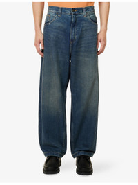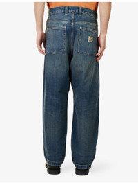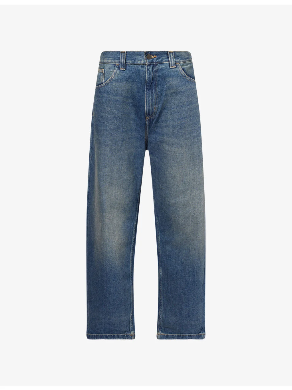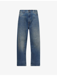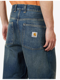 PRODUCT DETAILS - Cahartt WIP denim jeans - 100% cotton - Button and zip-fly fastening - Relaxed fit, high-rise, straight leg, belt loops, five pockets, brand patch at back, faded wash, topstitch detailing - Machine wash cold - Size UK medium: rise 15in / 39cm, inside leg 27.9in / 71 cm, leg opening 18in / 46cm - Model is 6ft 2in/1.88m and wears a size medium - Midweight, non-stretch Ref: R04481682