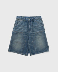 The OG Aden Double Knee Short by Carhartt WIP has a wide fit and is made from heavyweight recycled cotton denim. The design is inspired by the silhouette of classic work pants and features double-layered knees, tool pockets, and a hammer loop. Bar tacks, triple stitching, and rivets provide additional durability. There is a woven square label on the back pocket. - Double-layered knees - Bar tacks - Square label Article number: I036272-01.B7 Gender: men Color: Blue Material: 100% Cotton