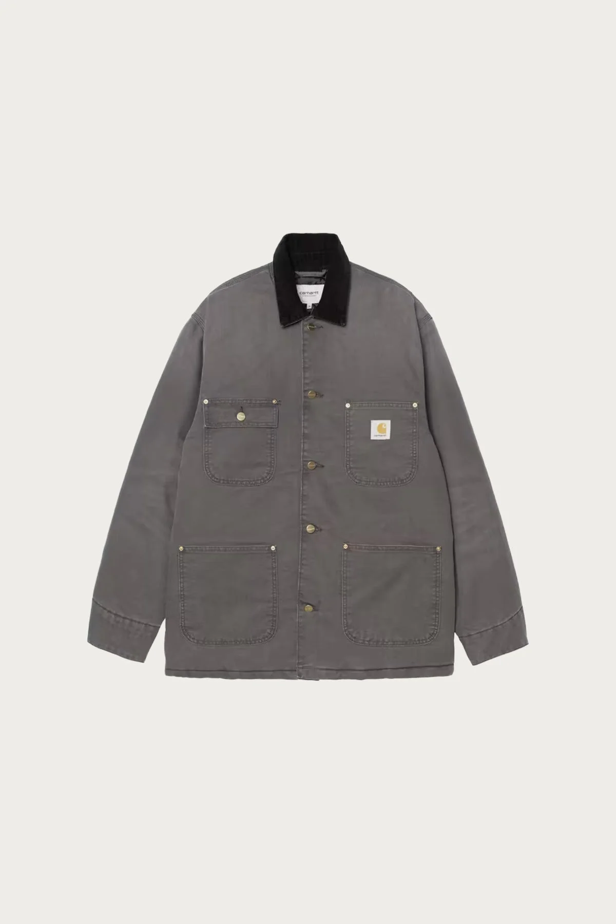 The OG Chore Coat is constructed in WIP's signature loose fit using heavyweight cotton Dearborn Canvas. It includes a diamond-quilted lining for added insulation, complemented by a corduroy collar and front patch pockets that add texture and practicality. Triple-stitching and rivets reinforce key stress points for enhanced durability. The look is finished with a woven Square Label for a polished detail. - 100% Organic Cotton 'Dearborn' Canvas, 12 oz - Original loose fit - Diamond quilted lined - Interior chest pocket - Triple-stitched - Corduroy collar - Front closure with buttons - Two pockets at chest, one with flap and button closure - Bartack stitching or rivets at vital stress points - Adjustable cuffs - Branded buttons - Square label - Graphite/Black Stone Canvas
