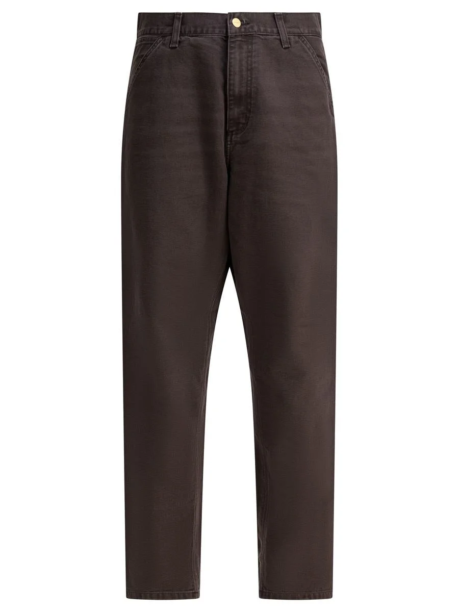 Carhartt WIP "Single Knee" pants, made of heavy Dearborn cotton canvas. Comfortable straight-leg construction, regular waist. Reinforced seams with triple stitching along the most stressed areas and joist stitching at the points of greatest wear. Features side pockets, hammer loop and tool pockets. Front zipper closure and square fabric label detail applied to the back. || - Solid color - Mid-rise - 100% Dearborn cotton canvas - Straight leg with a comfortable cut - Triple topstitching - Joist stitching at major wear points - Hammer loop - Tool pockets - Zipper flap - Square fabric label with logo - Regular fit Extra Description: Solid colourRegular fit;Mid rise Gender: Men Material: 100% COTTON Color: BROWN Made in: Imported Product ID: I034798474O.32 *Import tax/duty will be calculated at checkout (If applicable)