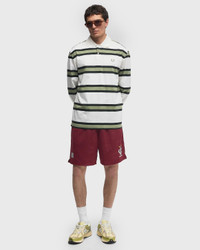 The Carhartt WIP Hartt's Football Short is made from lightweight polyester and has a relaxed fit with a regular waist. The style features a jacquard motif and embroidered graphic. - Relaxed fit, regular rise - Elastic waistband with drawcord - Back and side pockets - Embroidered graphic Article Number: I034623-2UG.XX Gender: Men Color: HEART TRAIN JACQUARD, MULBERRY Material: 100% Polyester