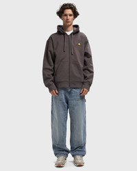 The loose-fitting Hooded American Script Jacket by Carhartt WIP is made from heavy polyester-cotton jersey that has been brushed for a fleece-like interior. It features an adjustable hood, a zipper, and a split kangaroo pocket. An American Script logo on the chest completes the design. - Full-length zipper - Split kangaroo pocket - Adjustable hood Article number: I033063-33C.XX Gender: men Color: PORPHYRY Material: 80% Cotton, 20% Polyester