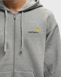 The loose-fitting Hooded American Script Jacket by Carhartt WIP is made from heavy polyester-cotton jersey that has been brushed for a fleece-like interior. It features an adjustable hood, a zipper, and a split kangaroo pocket. An American Script logo on the chest completes the design. - Full-length zipper - Split kangaroo pocket - Adjustable hood Article number: I033063-V6.XX Gender: men Color: Grey Heather Material: 80% Cotton, 20% Polyester