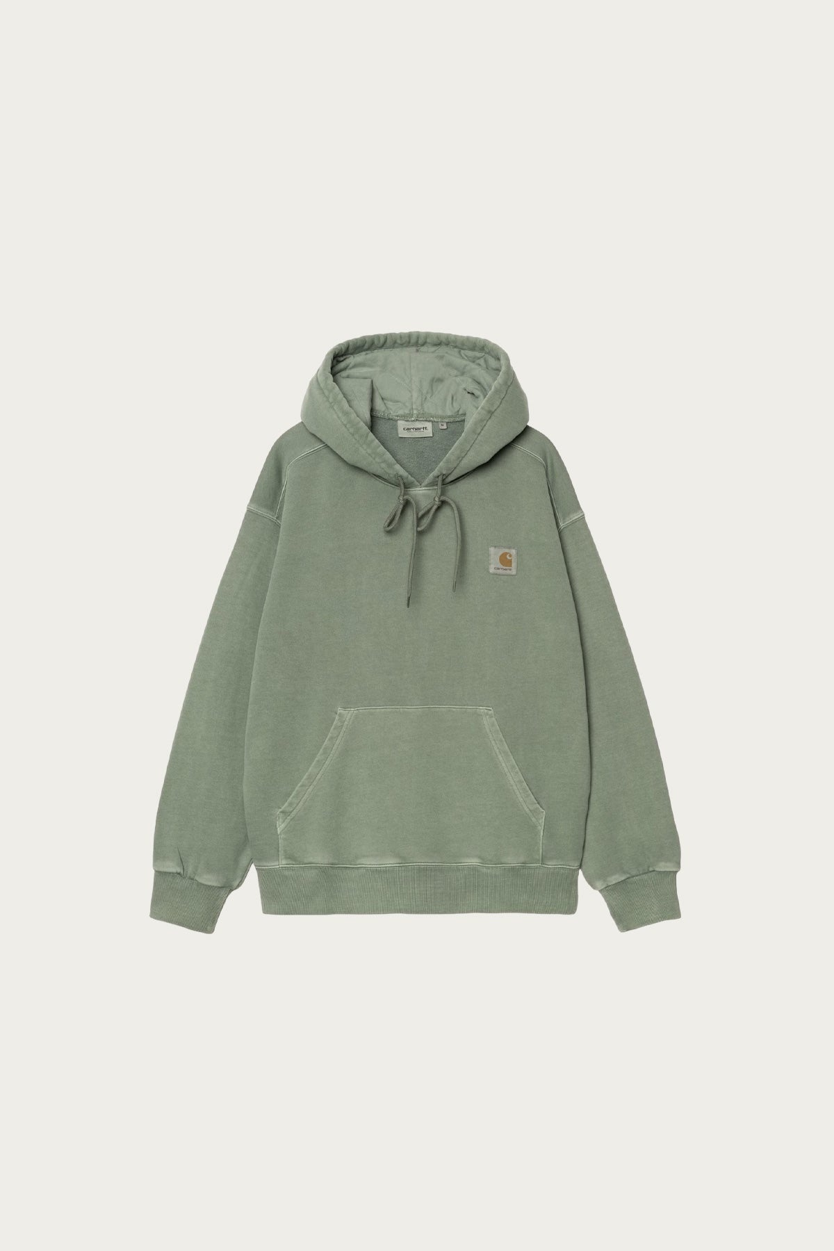 The Hooded Nelson Sweatshirt is constructed from heavyweight, unbrushed cotton jersey. The garment has been pigment dyed for a more saturated color. Features a kangaroo pocket and a diamond quilted hood with padded lining. This item has a bold 'balloon' fit, which is a little looser and boxier, but also characterized by dropped shoulders and ribbed cuffs. Finished with a classic woven Carhartt WIP label on the left chest. - 100% Cotton Sweat, 370 g/sqm - balloon fit - unbrushed - pigment dyed - adjustable diamond quilted and padded lined hood - kangaroo pocket - overdyed square label