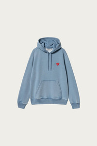 Soft in color and feel, the Hooded Ingo Sweatshirt in Light Blue Garment Dyed offers a fresh take on a classic silhouette. Made from the same heavyweight, unbrushed cotton jersey, its garment-dyed finish provides a gentle, washed-out hue and a comfortable, broken-in texture. The heart patch on the chest adds a subtle detail. - 100% cotton - Loose fit - Garment-dyed for a unique color and softer feel - Adjustable hood with drawstring - Kangaroo pocket - Heart patch on chest