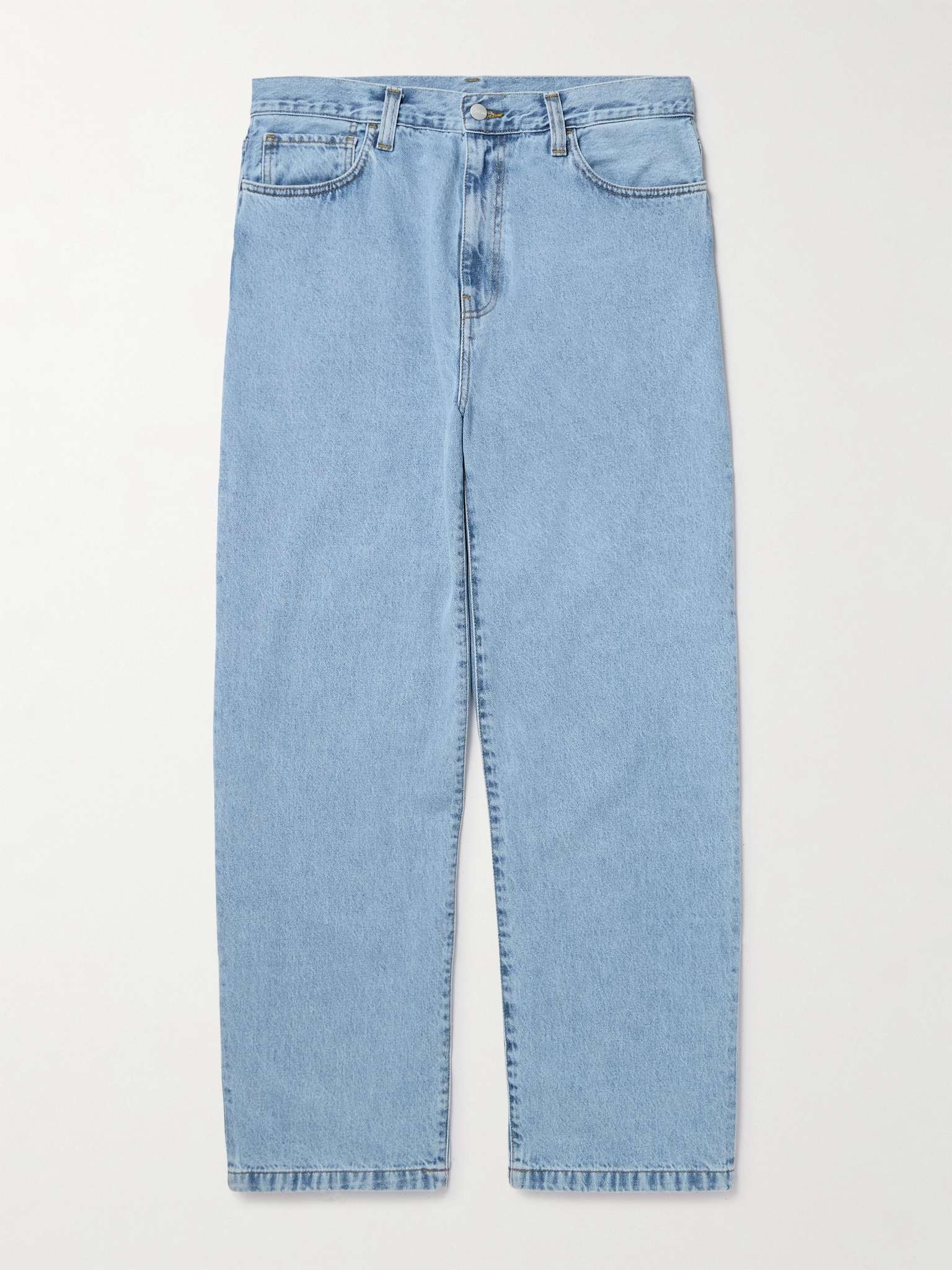 Good jeans are immune to the trend cycle - if treated, they'll last you a considerable number of years. Carhartt WIP's are made from sturdy denim and stone-washed, so they have a vintage appearance. Size & Fit - Fits true to size. Take your normal size - Wide leg, low-crotch style - Mid-weight, non-stretchy fabric - Model is shown wearing a 32 - UK/US waist sizing Details & Care - Light-blue denim - Button and zip fastening - 100% cotton - Machine wash - Designer colour: Blue Bleached