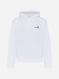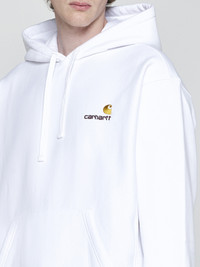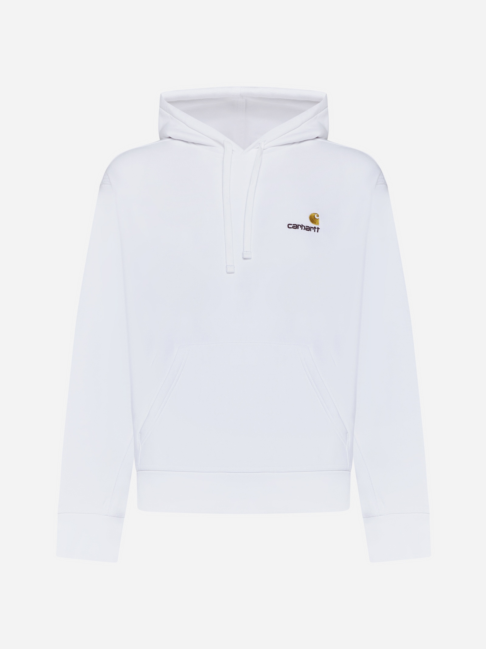 Carhartt WIP’s white cotton blend hoodie featuring a hood with adjustable drawstring, embroidered logo on the chest, kangaroo pocket and ribbed edges. Color: White Size and fit: Model is 184 cm tall and wearing a size M Composition: 80% cotton 20% polyester Country of manifacture: Extra EU ID designer: I028279-02XX