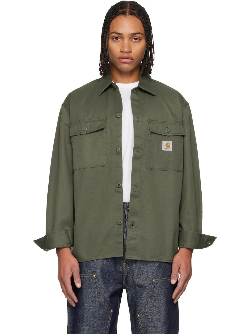 Cotton twill overshirt. · Spread collar · Button closure · Flap pockets at chest · Logo patch at chest · Vented side seams · Dropped shoulders · Pleats at buttoned barrel cuffs · Locker loop and box pleat at back yoke Supplier color: Leaf 100% cotton. Made in Tunisia 261111M192001