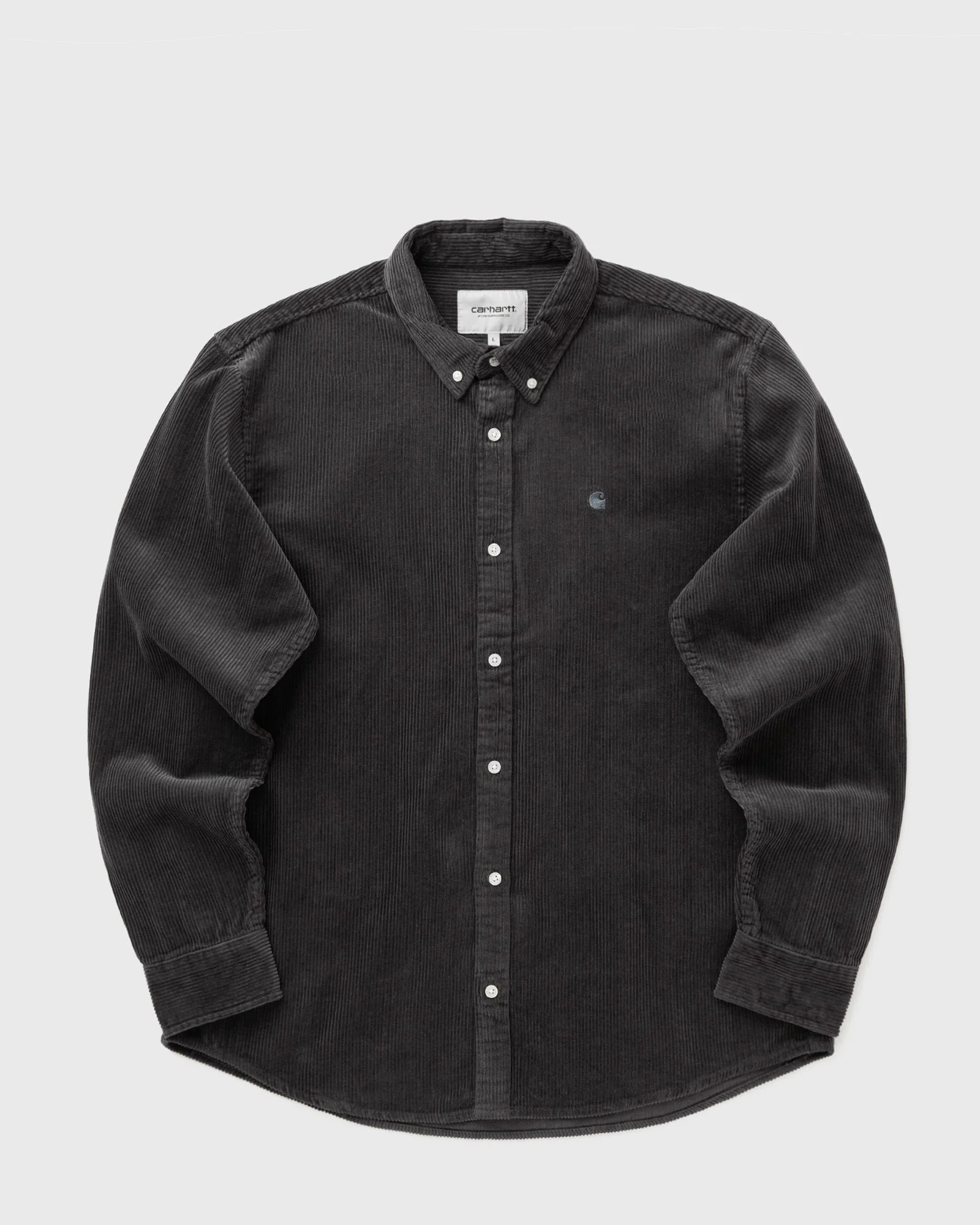 The long-sleeved L/S Madison Cord Shirt by Carhartt WIP is made from heavyweight eight-rib cotton corduroy and garment-washed. It features a button-down collar and embroidered logo on the left chest. - Button-down collar - Garment-washed treatment - Embroidered logo Article number: I029958-2F9.XX Gender: men Color: GRAPHITE / GRAPHITE Material: 100% Cotton