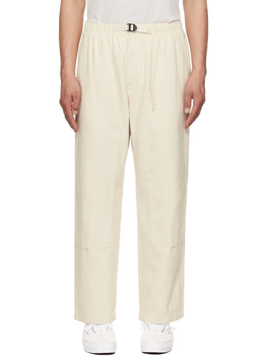 Heavyweight 10.2 oz hemp- and cotton-twill trousers. · Mid-rise · Integrated cinch belt and belt loops at elasticized waistband · Four-pocket styling · Zip fly · Reinforced panel at legs · Textile logo patch at back pocket Supplier color: Natural Body: 55% hemp, 45% cotton. Lining: 100% cotton. Made in Cambodia 251111M191027