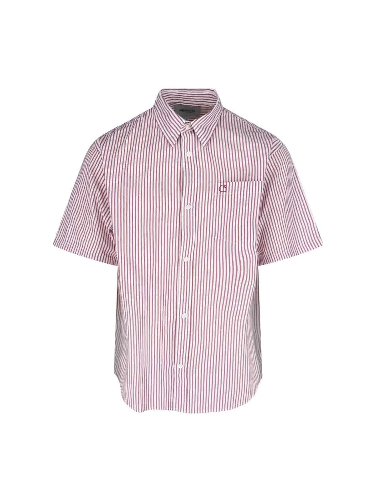 CARHARTT WIP 'S/S PHELPS' STRIPED SHIRT IN RED COTTON WITH WHITE STRIPE PATTERN, CLASSIC COLLAR, SHORT SLEEVES, BUTTON CLOSURE, CHEST POCKET, LOGO EMBROIDERY DETAIL, STRAIGHT HEM. PRODUCT INFO PRODUCT CODE I0345322SRXX COMPOSITION: 100% COTTON SIZE AND FIT: SOFT FIT MADE IN: VIETNAM