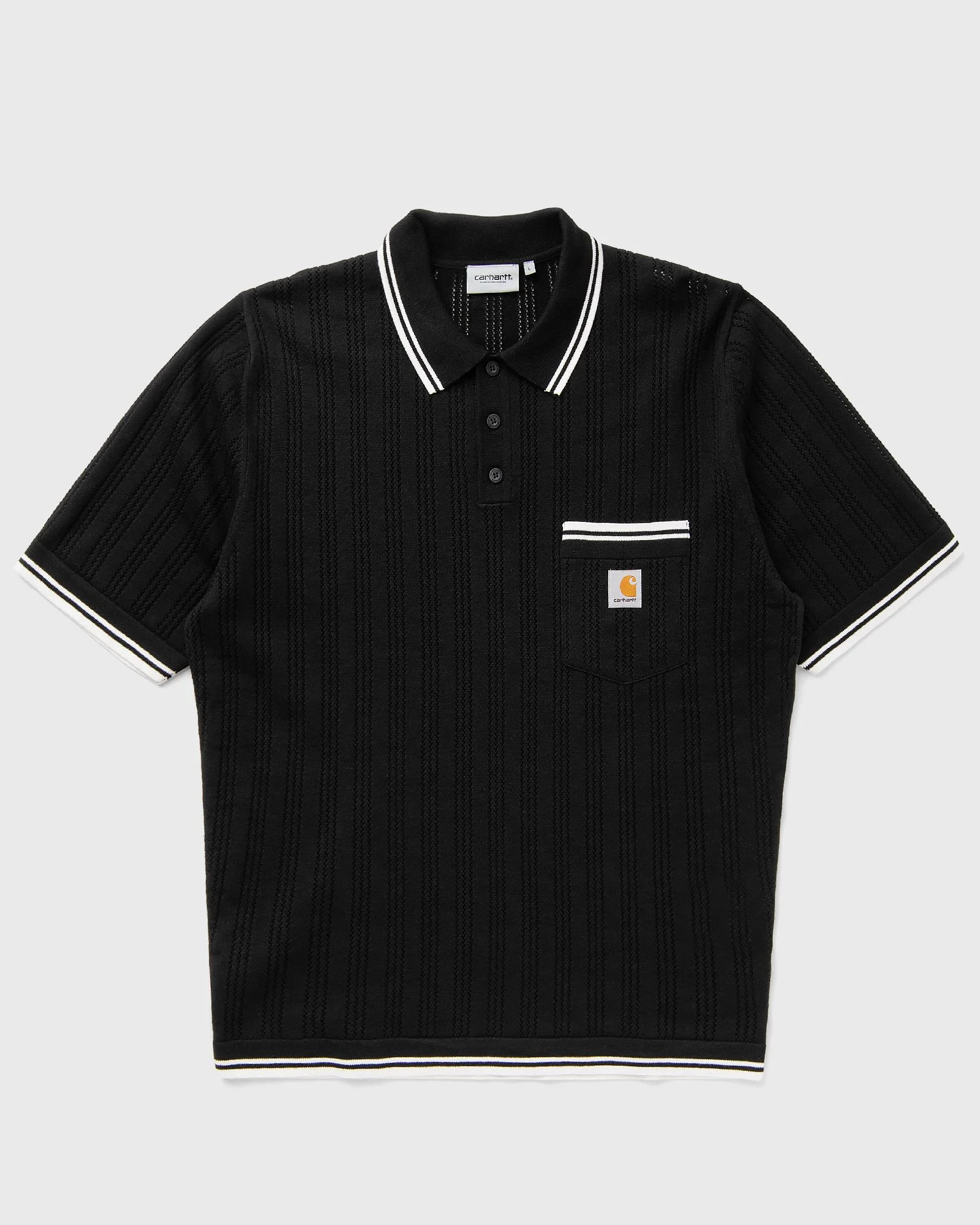 The S/S Ramsey Polo by Carhartt WIP is a lightweight cotton knit with an open ajour design and striped contrast elements. The style features a short button placket and a chest pocket with a woven square label. - Button placket - Chest pocket - Square label Article number: I036168-K02.XX Gender: men Color: Black / Wax Material: 100% Cotton