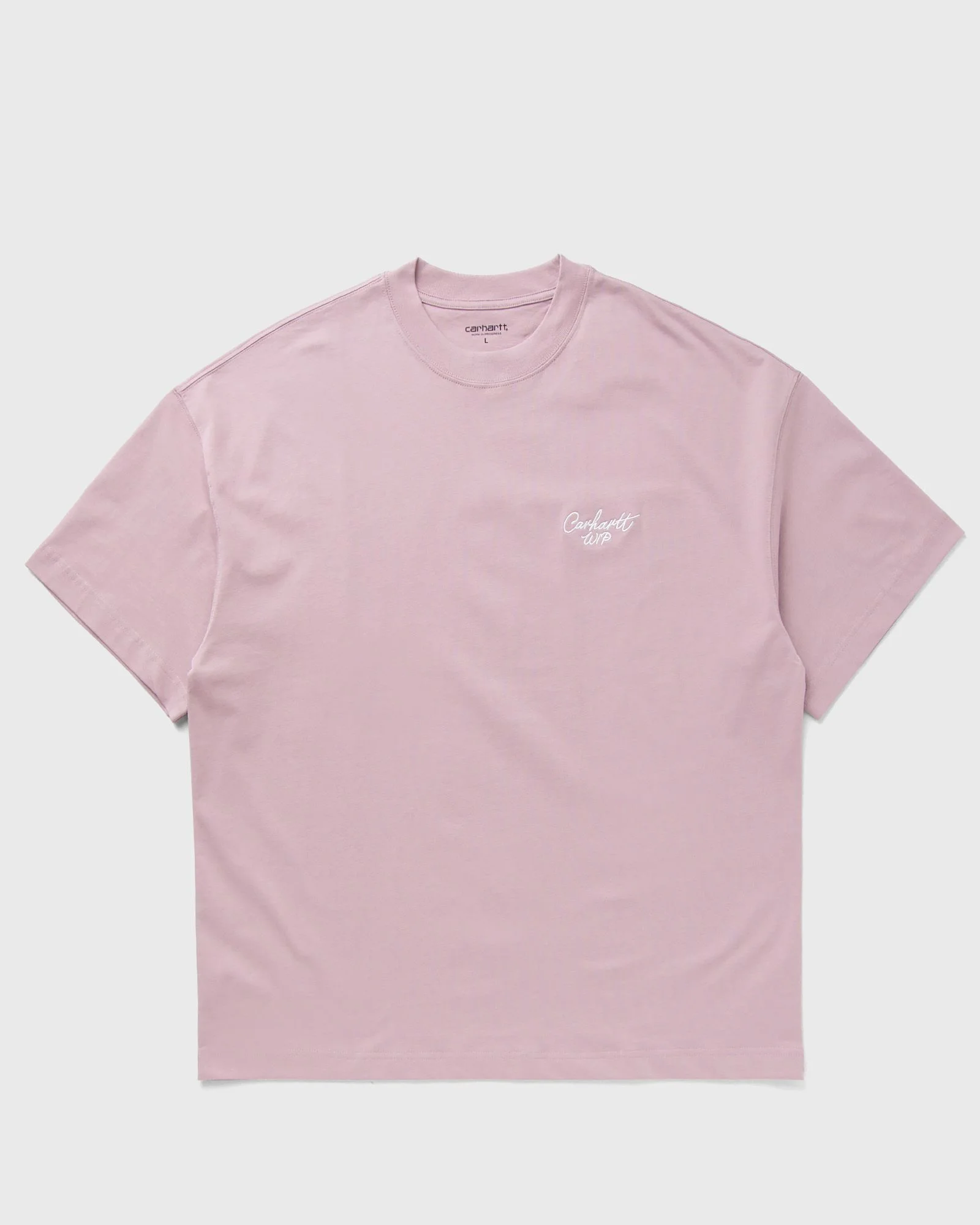 The loose and boxy cut S/S Signature Script T-shirt by Carhartt WIP is made from medium-weight organic cotton jersey. An embroidered graphic on the chest rounds off the design. - Boxy loose fit - Short sleeves - Embroidered graphic Article number: I033828-2QS.XX Gender: men Color: HORTENSIA / WHITE Material: 100% Cotton