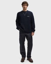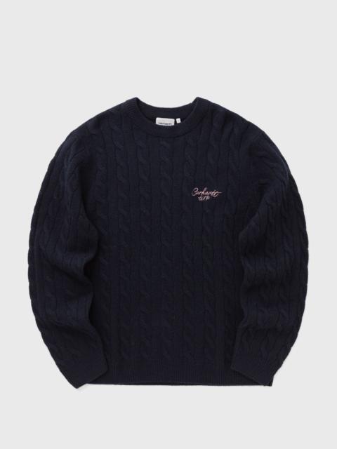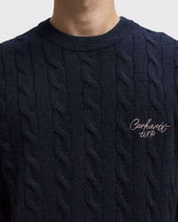 The Carhartt WIP Signature Sweater is a heavy cable knit design made from a soft lambswool blend. An embroidered graphic on the chest completes the design. - Ribbed crew neck collar - Ribbed cuffs and hem - Embroidered graphic Article number: I033885-3CF.XX Gender: men Color: DEEP NIGHT / GLASSY PINK Material: 20% Polyester, 80% Wool