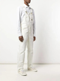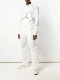 White cotton denim overalls from Carhartt WIP featuring adjustable shoulder straps, a front logo patch, a side button fastening, two back patch pockets, a relaxed fit and a straight leg. Size & Fit Model Measurements: Height: 1.85 m Bust/Chest: 101.0 cm Hips: 93.0 cm Waist: 71.0 cm Model wears size 30 Fabric and Care Designer Style ID: I026462 Designer Colour: WAX Composition: Lining: Cotton 35%, Polyester 65%; : Cotton 100% Washing instructions: Machine Wash Made in Tunisia