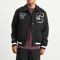 Carhartt WIP, where athletic heritage meets graphic details, delivers a standout layer with the world class varsity jacket. Crafted from heavyweight poly-wool felt and lined with diamond-quilted nylon, it balances warmth and structure. Embroidered graphics and patches span the body and sleeves, channelling vintage varsity energy with a modern edge. Rib-knit cuffs and hem add classic contrast, while piped front pockets and branded snap buttons complete the silhouette. - 70% Polyester, 30% Wool - Nylon Diamond-Quilted Lining - Embroidered Graphics & Patches - Piped Front Pockets - Interior Chest Pocket - Ribbed Trims - Branded Snap Buttons - Style Code: I035432-89XX