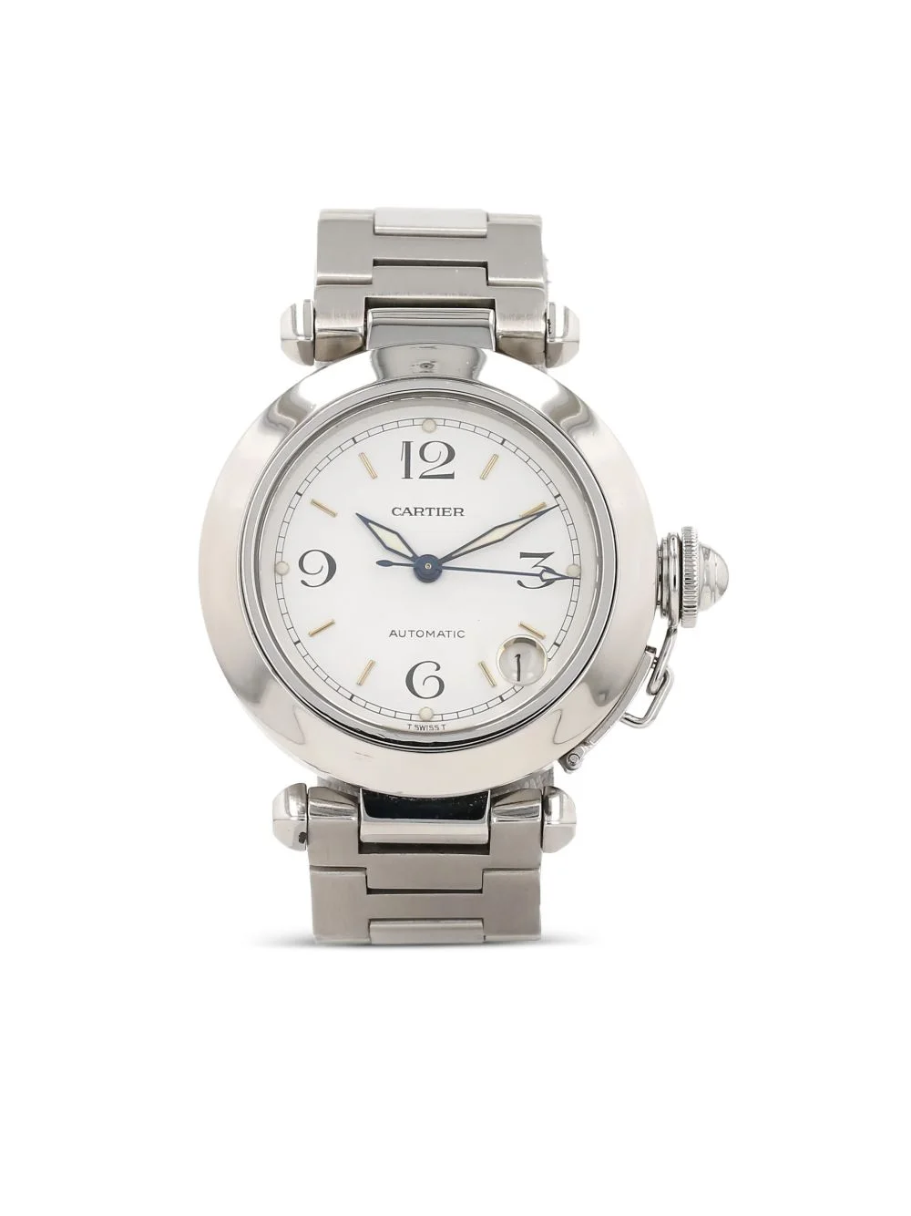 1999 Pasha 36mm Highlights - 1999 - White dial - Round case - Railroad minuterie dial - Arabic numerals - Applied baton hour markers - Automatic movement - Screwed crown protection - Stainless steel bracelet - Central second hand - Date aperture - Stainless steel case - This item comes with a standard one-year warranty from the boutique. Made in France Composition Steel 100% SIZE & FIT Measurement Case size 1.41 in(36 mm) Maximum strap length 6.69 in(17 cm)
