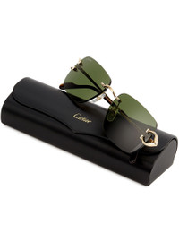 Info & Care Cartier gold-tone sunglasses Green;lenses rimless frame signature C detail at temples dark tortoiseshell acetate tips 100% UV protection Presented in a designer-stamped box with a hard case and cleaning cloth Size & Fit Frame width: 14cm Frame height: 4cm