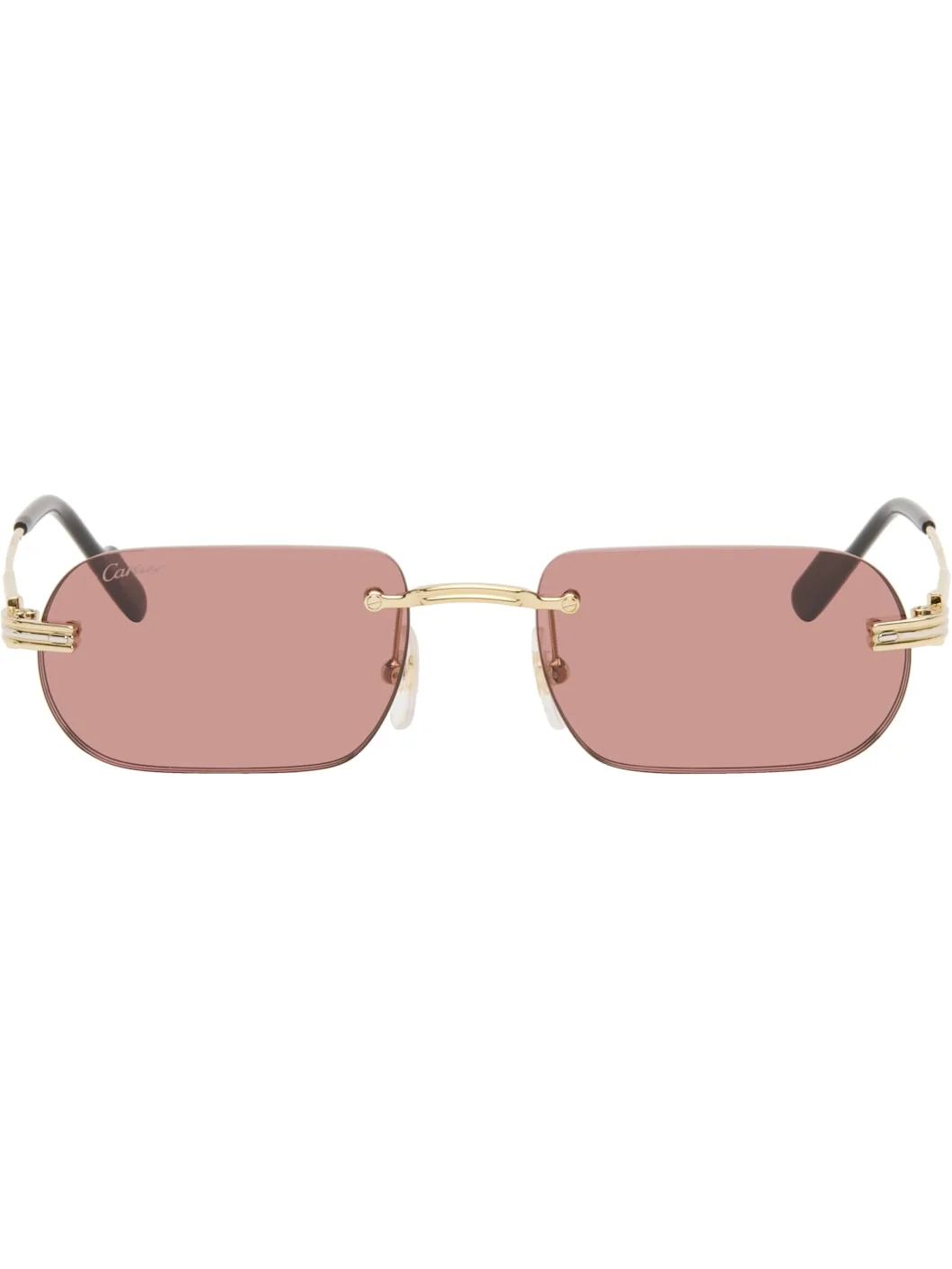 Rectangular rimless metal-frame sunglasses. · Red lenses · 100% UV protection, category 2 · Logo etched at lens · Adjustable rubber nose pads · Logo hardware at temples · Logo plaque at acetate temple tips · Includes case · Size: 55.18 145 Supplier color: Gold/Gold/Red Metal. Made in France 261346M134015