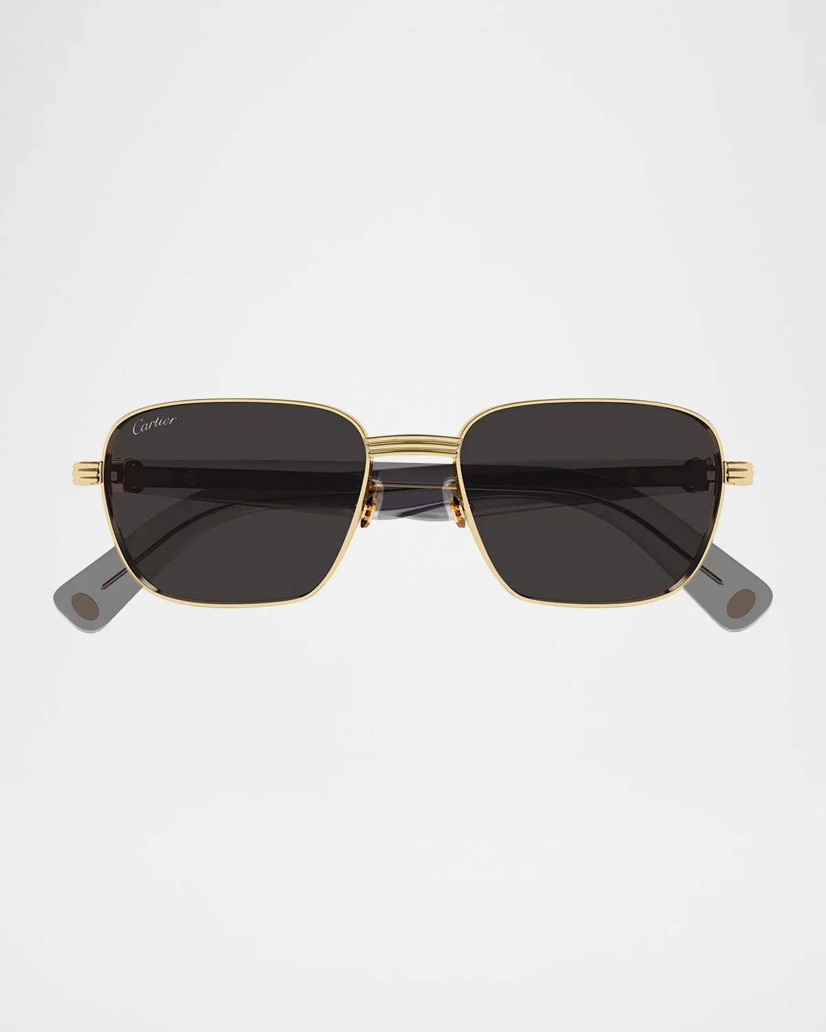 The distinctive Chinges define these premium metal Cartier sunglasses Lens/bridge/temple (in mm): 5618145 Solidcolor lenses Logo signature on the right lens Adjustable nose pads Exposed metal corewire Metal 100% UVA/UVB protection Made in France