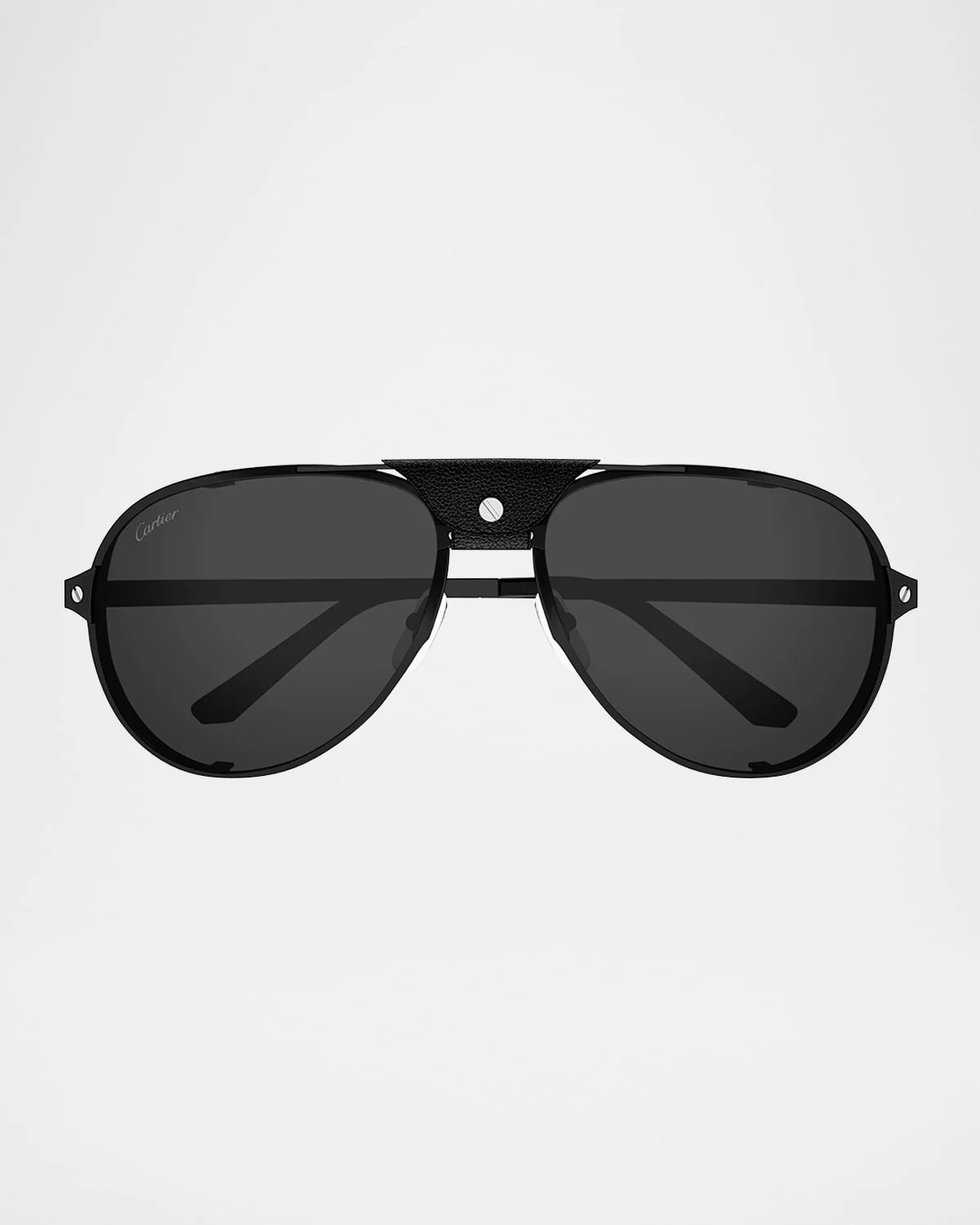 - Cartier "CT0296SM" aviator sunglasses in metal - Lens/bridge/temple (in mm): - 61-17-135 - Features a leather nose bridge and leather side shields - Solid-color lenses - Right lens logo script - Adjustable nose pads - Engraved logo on the temples - Curved, capped temple tips - Metal/leather - Made in Italy - Proposition 65 warning for California residents