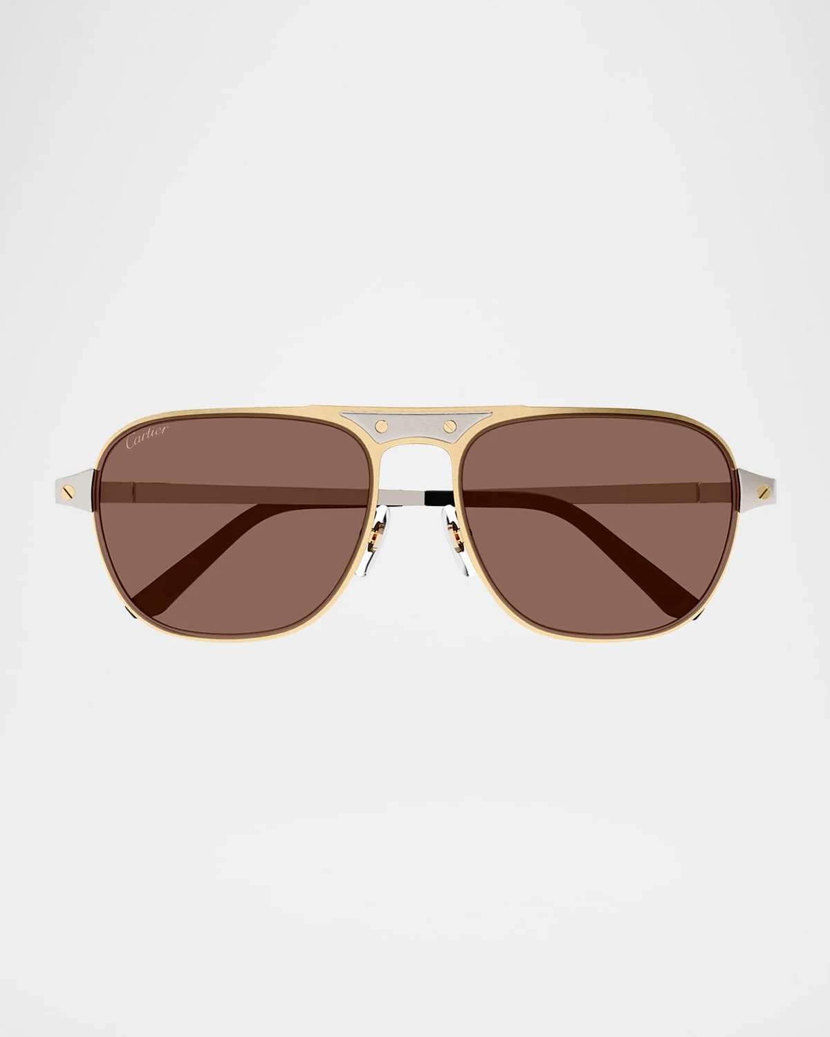 - Cartier "CT0532SM" aviator sunglasses in two-tone metal - Lens/bridge/temple (in mm): - 58-17-145 - Solid-color lenses - Right lens logo script - Adjustable nose pads - Engraved logo on the temples - Curved, capped temple tips - Metal - Made in France - Proposition 65 warning for California residents