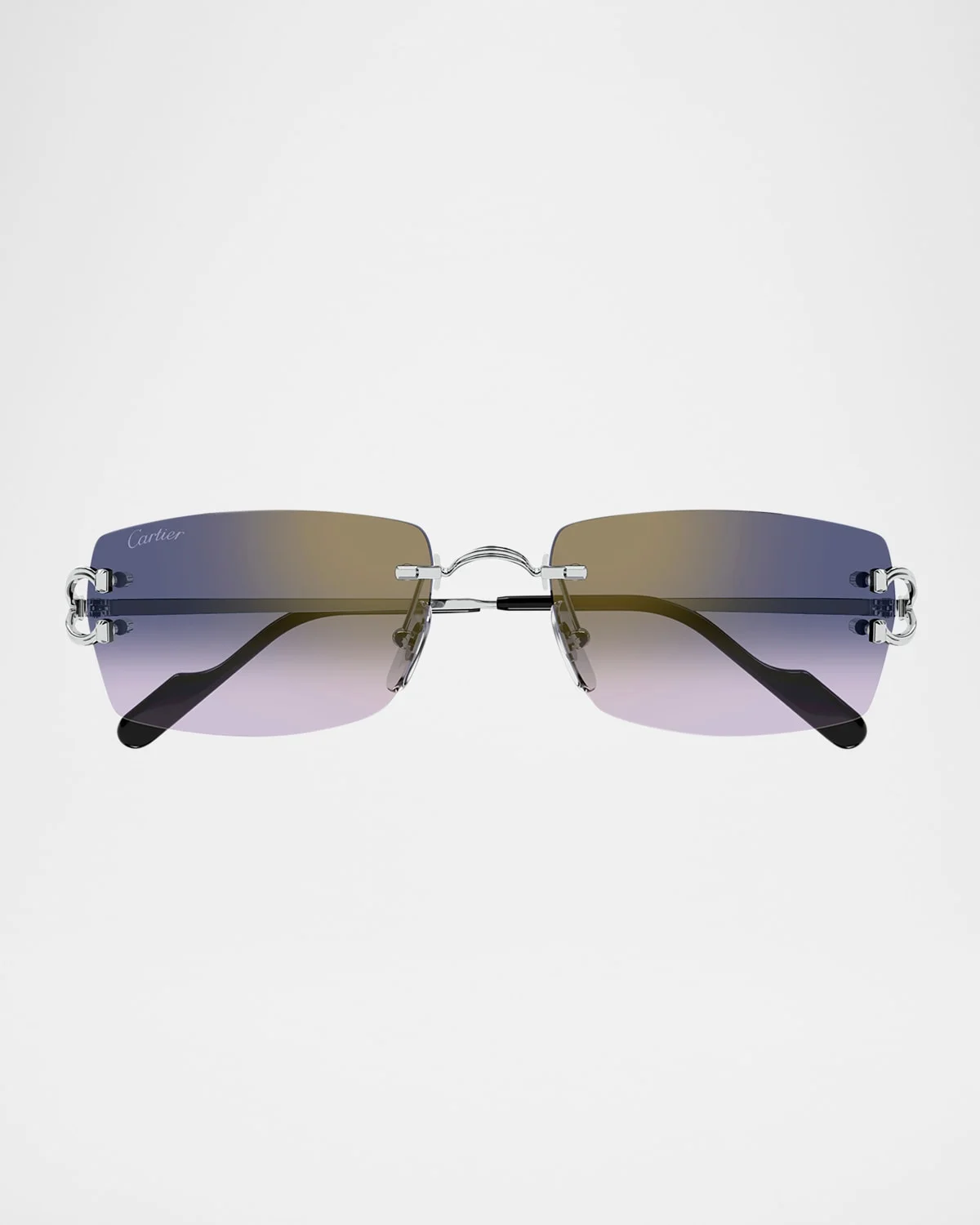 - Cartier "CT0550SM" rectangle sunglasses in metal - Lens/bridge/temple (in mm): - 56-18-140 - Solid-color lenses - Right lens logo script - Adjustable nose pads - Curved, capped temple tips - Metal - 100% UVA/UVB protection - Made in France - Proposition 65 warning for California residents
