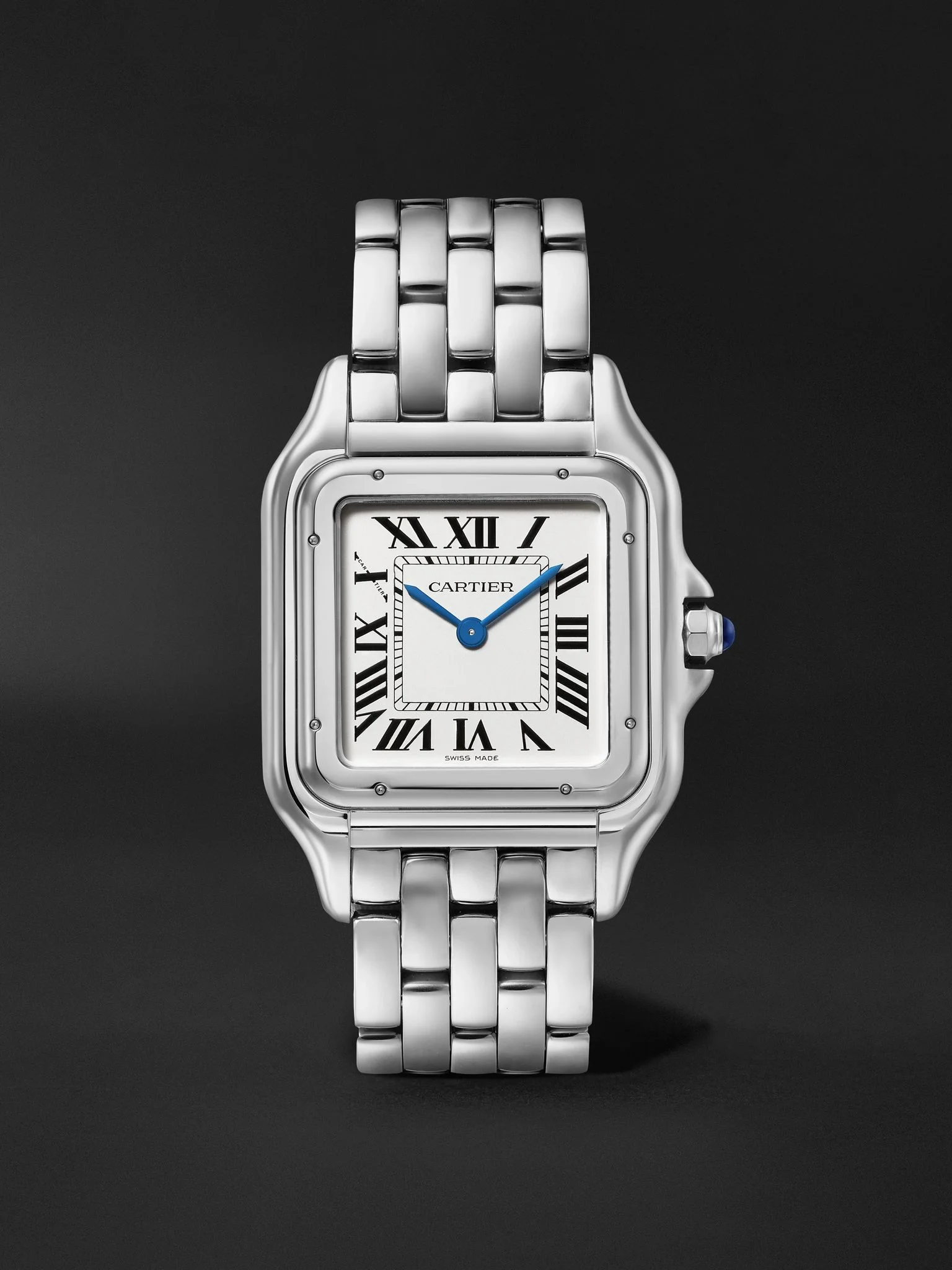 Cartier's 'Panthere de Cartier' watch has been one of the house's most iconic jewels since the '80s. Cast from polished stainless steel, this large version has a recognisable square face with sleek black Roman numerals and signature blued steel hands that match the spinel crown. For warranty information, please refer to details & care Details & Care Movement - Quartz movement Functions - Hour and minute hands Dial - White dial - Black Roman numerals and markers, blued steel sword-shaped hands Case - Stainless steel case - Crown with blue cabochon for time adjustments - Sapphire glass crystal - Engraved case back - Invisible clasp-fastening stainless steel bracelet Specifications - Case width: 31mm; case height: 42mm; case thickness: 6.71mm - Water resistance: 3 bar - Comes in a presentation box - Reference number: WSPN0016 We offer a two-year warranty for all working parts and manufacturing faults for luxury watches. For more information, contact one of our experts by emailing watches@mrporter.com