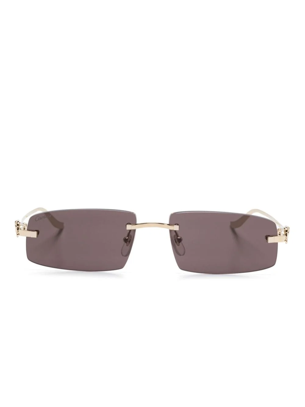 Panthere de Cartier sunglasses Highlights - Gold-tone - Polished finish - Rectangle frame - Rimless - Grey tinted lenses - Signature panther plaque - Logo-engraved arm - Curved tips - Nose pads - These glasses come with a protective case. Made In France Composition Metal 100% SIZE & FIT Measurement Arm Length 5.31 in(13.5 cm) Bridge Width 0.62 in(1.6 cm) Lens Diameter 2.28 in(5.8 cm) Total Width 5.59 in(14.2 cm)