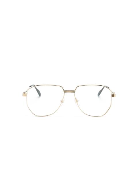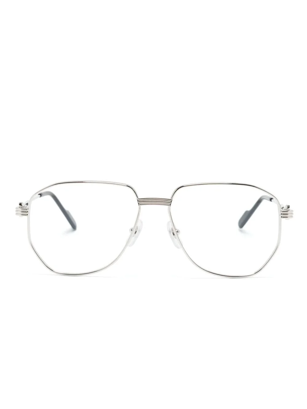 pilot-frame glasses Highlights - Silver-tone - Metal - Pilot frame - Clear lenses - Nose pads - Straight arms with curved tips - Engraved logo to the tip - These glasses come with a protective case. - All glasses from farfetch are sold as non-prescription frames. Made in Italy Composition Metal 100% SIZE & FIT Measurement Arm Length 5.7 in(14.5 cm) Bridge Width 0.59 in(1.5 cm) Lens Diameter 2.28 in(5.8 cm) Total Width 5.51 in(14 cm)