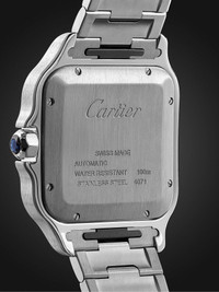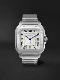 Mr Louis CartieR designed the first ever 'Santos' reference in 1904 as an alternative to pocket watches. He did this especially for his close friend Mr Alberto Santos-Dumont, an early aviation pilot who wanted to be able to check the time in the air. This version of the iconic timepiece is Swiss-made from polished stainless steel and features the signature exposed screws and silvered dial marked with Roman numerals. The house's 'QuickSwitch' option means you can easily swap the chain-link strap for the tan leather one. We offer a two-year warranty for all working parts and manufacturing faults for luxury watches. Call our Customer Care team for more information. Details & Care Movement - Swiss-made caliber 1847 MC automatic movement with 42-hour power reserve - 23 jewels, 4 Hz 8,800 vph Functions - Hour, minute and second hands - Date window Dial - Silvered opaline dial - Case - Stainless steel case - Screw-in crown for time adjustments and manual winding - Scratch-resistant sapphire crystal - Clasp-fastening stainless steel bracelet and tan leather strap Specifications - Case diameter: 39.8mm; case thickness: 9.08mm - Water resistance: 10 bar - Comes in a presentation box - Reference number: CRWSSA0009