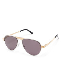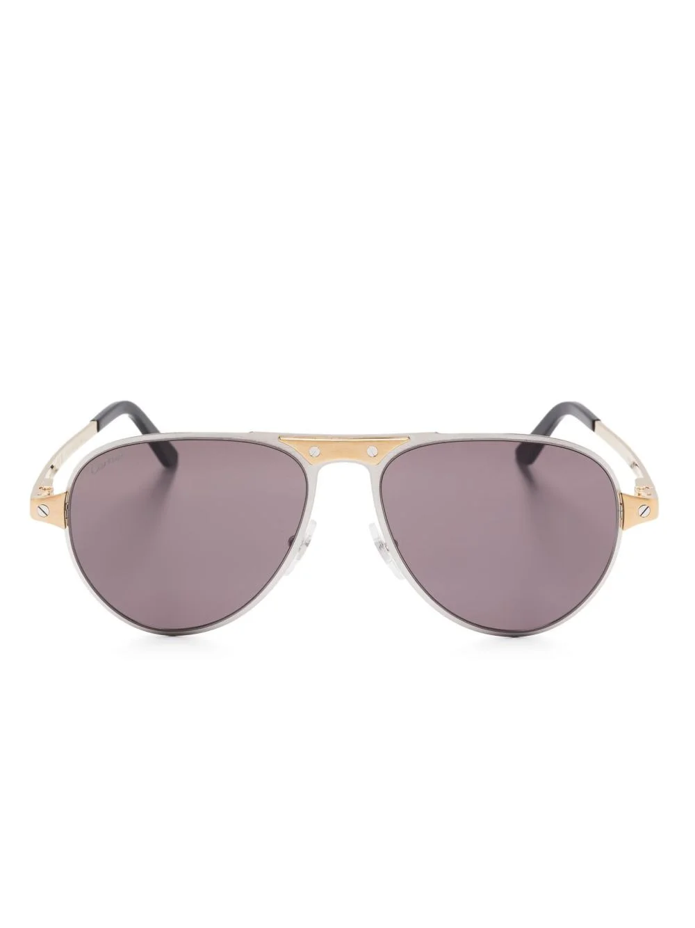 Santos De Cartier sunglasses Highlights - Silver-tone - Nose pads - Curved tips - Logo-engraved arm - These glasses come with a protective case. Made in France Composition Metal 100%, Acetate 100% SIZE & FIT Measurement Arm Length 5.7 in(14.5 cm) Bridge Width 0.62 in(1.6 cm) Lens Diameter 2.28 in(5.8 cm) Total Width 5.9 in(15 cm)