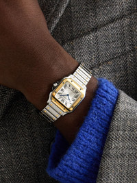 Louis Cartier made horological history in 1904 when he created the first wristwatch for his friend, Brazilian aviator Alberto Santos Dumont, to check the time while flying. Designed with the same rounded edges and exposed screws as the original, this small version has been made in Switzerland from polished stainless steel and 18-karat gold. The innovative 'QuickSwitch' feature allows you to easily swap out the bracelet for the midnight-blue leather strap, depending on your mood or the occasion. For warranty information, please refer to details & care Details & Care Movement - Swiss-made quartz movement Functions - Hour and minute hands Dial - Silver sunray dial - Blued steel sword-shaped hands, black Roman numerals and markers Case - Stainless steel and 18-karat gold case - Crown with blue cabochon for time adjustments - Sapphire glass crystal - Engraved case back - Interchangeable QuickSwitch folding clasp-fastening bracelet; additional buckle-fastening midnight-blue leather (Calf) strap Specifications - Case length: 34.5mm; case width: 34.5mm; case thickness: 7.08mm - Water resistance: 3 bar - Comes in a presentation box - Reference number: W2SA0033 We offer a two-year warranty for all working parts and manufacturing faults for luxury watches. For more information, contact one of our experts by emailing watches@mrporter.com