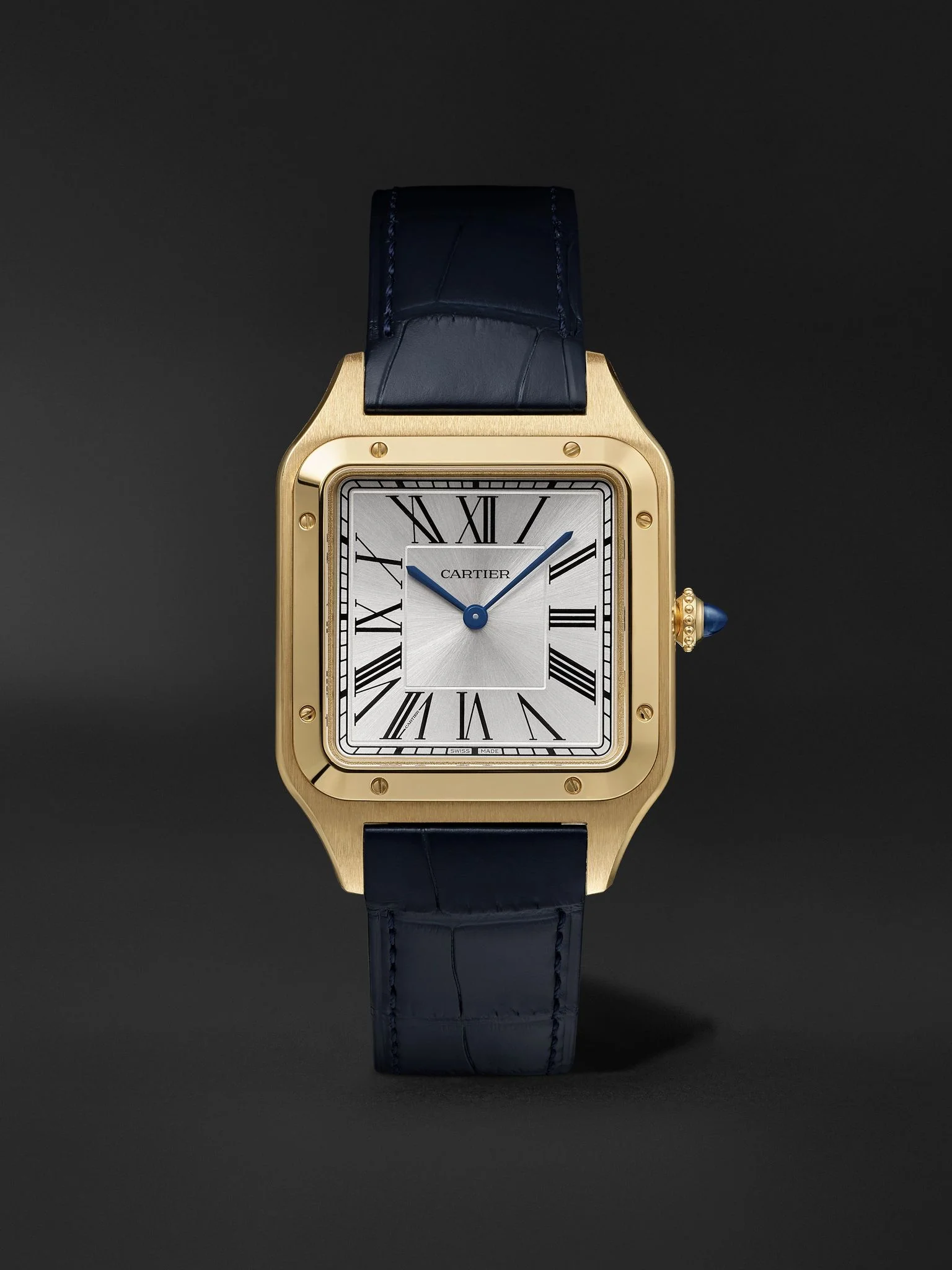 Brazilian aviator Alberto Santos-Dumont changed the course of modern timekeeping when he tasked Louis Cartier with designing a wearable alternative to a pocket watch that he could rely on mid-flight. Defined by the iconic square shape, this extra-large model has a satin-finish sunray-effect dial framed by an 18-karat gold case complete with signature exposed screws. A blue cabochon crown nods to the Maison's storied heritage. For warranty information, please refer to details & care Details & Care Movement - Hand-wound calibre 430 MC movement with 36-hour power reserve - 18 jewels, 21,600 Vph Functions - Hour and minute hands Dial - Silvered satin-finish sunray-effect dial - Blued steel sword-shaped hour and minute hands, black Roman numerals and markers Case - 18-karat gold case - Crown with blue cabochon for time adjustments and manual winding - Sapphire glass crystal - Engraved case back - Pin-buckle fastening navy alligator strap Specifications - Case height: 46.6mm; case width: 33.9mm; case thickness: 7.5mm - Water resistance: 3 bar - Comes in a presentation box - Alligator: USA - Reference number: CRWGSA0108 We offer a two-year warranty for all working parts and manufacturing faults for luxury watches. For more information, contact one of our experts by emailing watches@mrporter.com