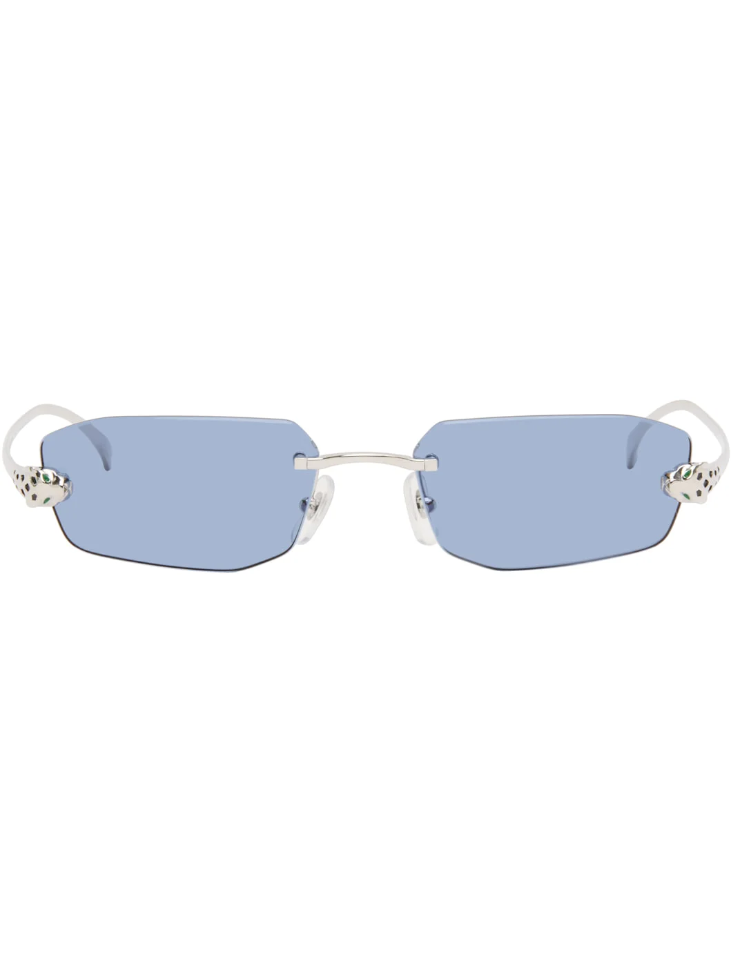 Rectangular rimless metal-frame sunglasses. · Blue lenses · 100% UV protection, category 2 · Adjustable rubber nose pads · Enameled graphic at temples · Includes case · Size: 56.18 140 Supplier color: Silver/Silver/Light Blue Metal. Made in Italy 261346M134034