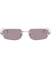 Rectangular rimless metal-frame sunglasses. · Purple lenses · 100% UVA/UVB protection, category 2 · Adjustable rubber nose pads · Graphic hardware at temples · Inset graphics at temple tips · Includes case · Size: 56.18 140 Supplier color: Silver/Silver/Violet Metal. Made in Italy 252346M134016