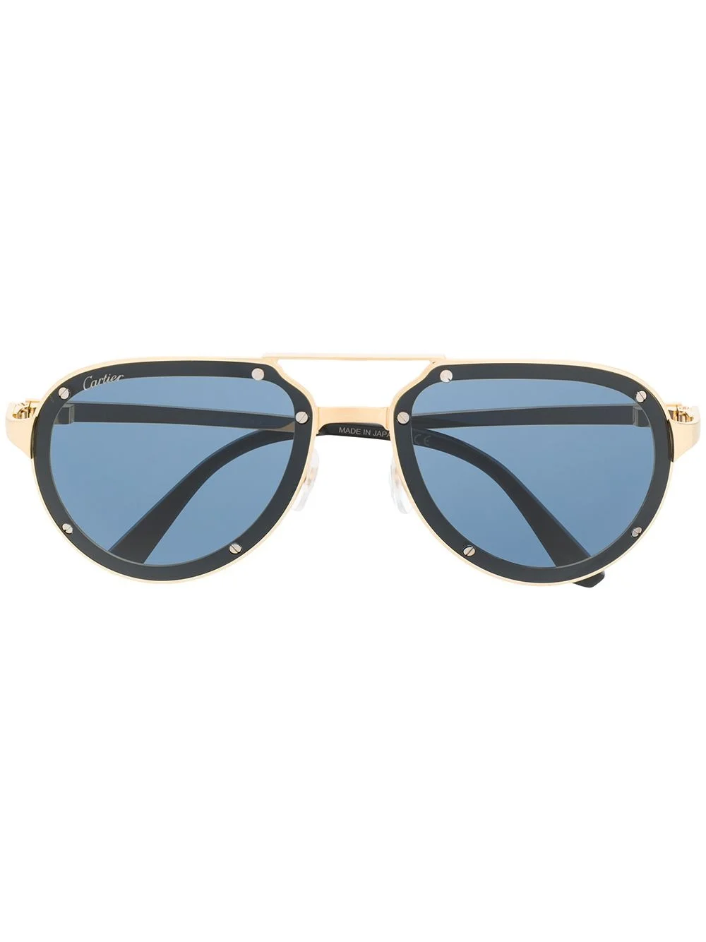 tinted pilot-frame sunglasses Crafted with oversized frames and tinted lenses to hide the effects of the night before, gold-tone screw details circle the entire design. Highlights - Titanium - Gold-tone - Pilot frame - Blue tinted lenses - Nose pads - Logo-engraved arm - Straight arms - Curved tips - These glasses come with a protective case. Made in France Composition Titanium 100% SIZE & FIT Measurement Arm Length 5.51 in(14 cm) Bridge Width 0.66 in(1.7 cm) Lens Diameter 2.36 in(6 cm) Total Width 5.94 in(15.1 cm)