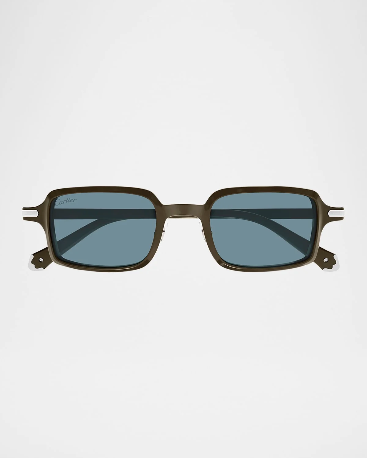 - Cartier "CT0539S" rectangle sunglasses in recycled acetate with silvertone metal accents - Lens/bridge/temple (in mm): - 49-22-145 - Solid-color lenses - Right lens logo script - Adjustable nose pads - Logo on the temples - Thin arms - Acetate - 100% UVA/UVB protection - Made in Italy - Proposition 65 warning for California residents - This product contains perfluoroalkyl and polyfluoroalkyl substances (PFAS). For more information, please visit the manufacturer’s website.