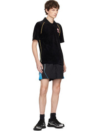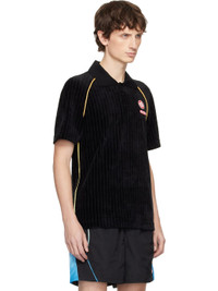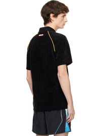 Ribbed stretch lyocell- and cotton-blend velour polo. · Rib-knit spread collar · Three-button placket · Rubberized logo patches at chest · Tennis-tail hem · Piping at side seams · Raglan sleeves · Rubberized logo patch at back collar Supplier color: Rib velour black Body: 50% lyocell, 25% cotton, 23% polyester, 2% elastane. Trim: 98% cotton, 2% elastane. Made in Portugal 252195M212009