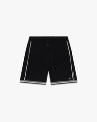 The black mesh shorts are a refined design, featuring the house's warped logo on the leg and striped detail down the sides. Completed with an elasticised waistband, drawstring fastening, in-seam pockets, and striped hem detail. - Cotton blend mesh fabric - 52% cotton 48% polyester - Colour: black - Specialised dry clean only - Made in China - - The model is 185cm / 6'1 and is wearing size M - Relaxed fit