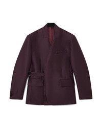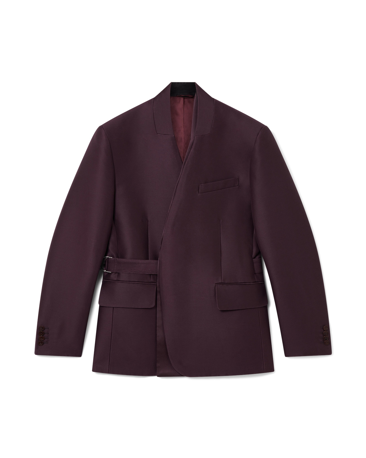 The wool silk blend tailored wrap jacket is a collarless, long-sleeve, double-breasted design crafted from a tailoring fabric, and inspired by traditional Japanese kimono dressing, with a specific focus on wrap and cross-over necklines. Completed with a belted closure, flap pockets, and interlocking CC logo on the cuffs. - Wool tailoring fabric - Main: 80% virgin wool 20% silk - Lining: 100% viscose - Colour: aubergine - Specialised dry clean only - Made in Portugal - The model is 187cm/6'1 and is wearing a size M