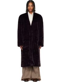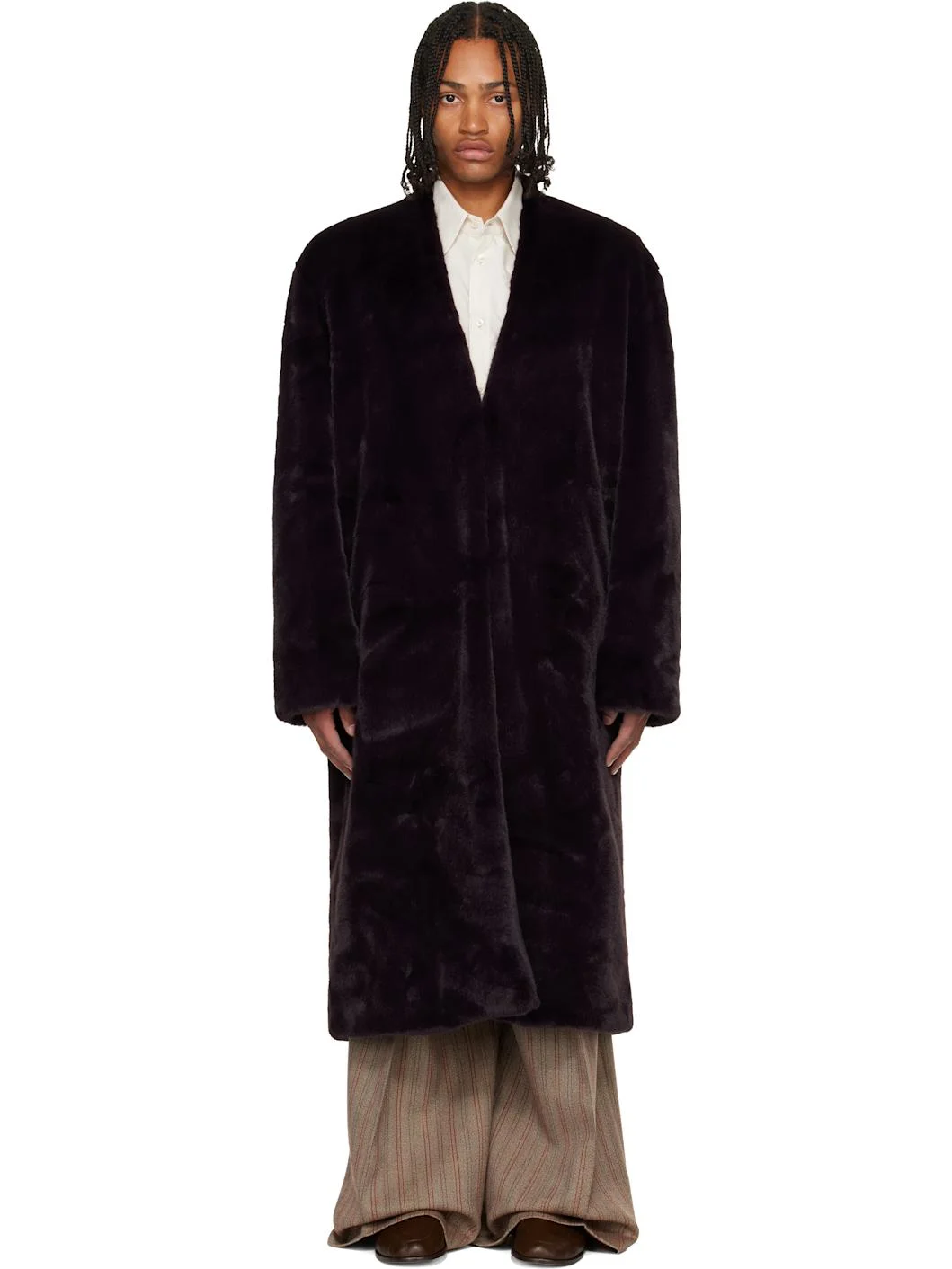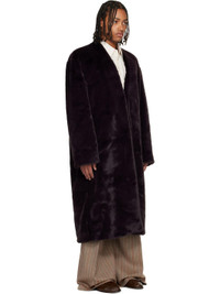 Faux-fur coat. · Shawl collar · Hook-eye closure · Grained lambskin trim at placket · Seam pockets at waist · Full satin lining Supplier color: Burgundy Body: 100% polyester. Lining 1: 100% polyester. Lining 2: 100% lambskin. Made in Lithuania 252195M176000
