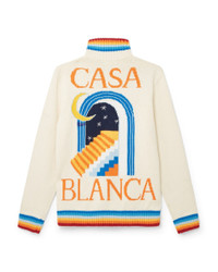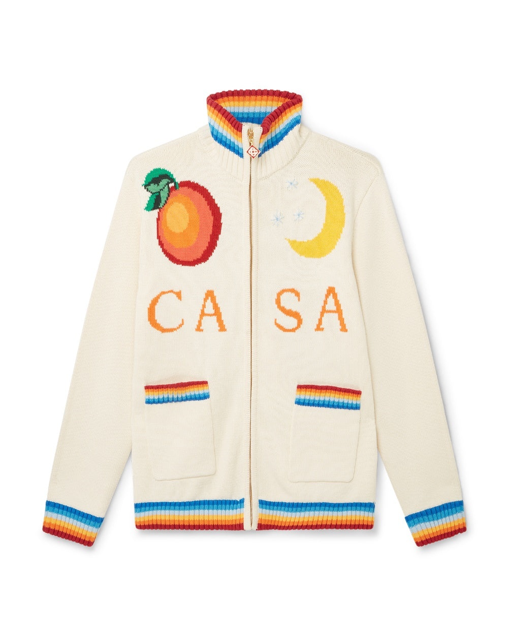 Men's Casa Club intarsia knit jacket in off-white, features detailed Casablanca iconography with our moon, oranges, and arch staircase all beautifully detailed within the knit. Finished with a tonal red and blue striped ribbed band collar and hemline, front zip fastening, and two front patch pockets. Cotton knit fabric 100% cotton Colour: off-white Specialised dry clean only Fits true to size, take your regular size The model is 187cm/6’1 and is wearing a size M